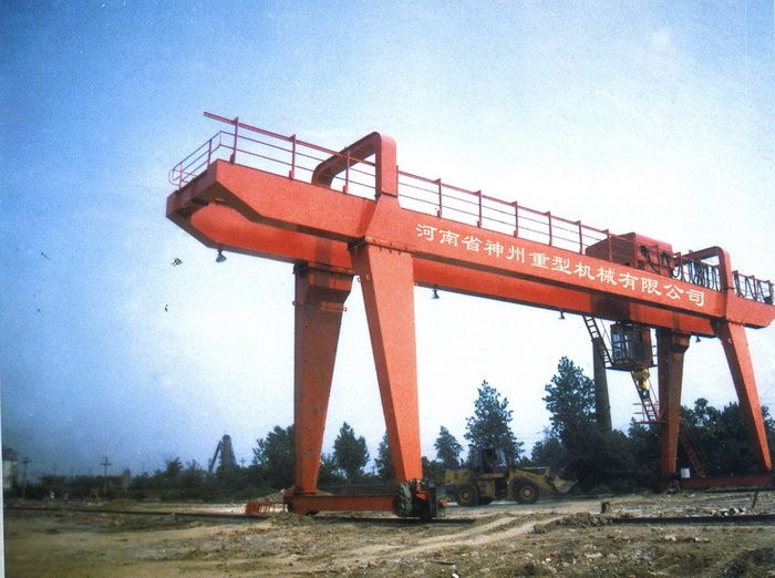 路橋門式起重機其主要用于橋梁建設(shè),工作速度慢,由門架、卷揚機小車、大車運行機構(gòu)、司機室和電氣控制系統(tǒng)組成。門架為桁架結(jié)構(gòu),具有結(jié)構(gòu)輕、抗風力強等 優(yōu)點。包括主梁、上端梁、支腿、下端梁、走行臺車及走臺欄桿等。主梁采用三角桁架結(jié)構(gòu),上面鋪設(shè)有軌道,供小車沿主梁方向作橫向移動。支腿采用箱形或鋼管 兩種形式。小車上布置有卷揚機,體積緊湊,自重輕。大車運行采用擺線針輪減速器,軟啟動電機,八輪四驅(qū)動,運行平穩(wěn)。操作方式采用閉式司機室,內(nèi)有可調(diào)式 座椅,底板鋪設(shè)絕緣墊,窗玻璃采用鋼化玻璃,配有滅火器、電風扇,可根據(jù)用戶要求配置冷暖空調(diào)、訊響器、對講機等物品。